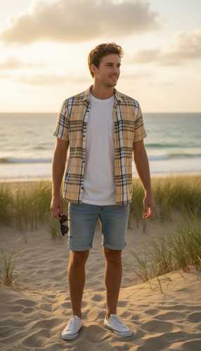 پیراهن آستین کوتاه چهارخانه بژ و سرمه ای برند Catch