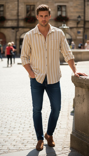 پیراهن آستین کوتاه راه راه کرم و طوسی برند Catch